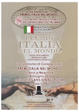 la XX Edizione del PREMIO ITALIA NEL MONDO si terrA'  a New York nella DELEGATES DINING ROOM - SOUTH DINING ROOM presso le NAZIONI UNITE in omaggio alla universalitA'  della cultura Italiana